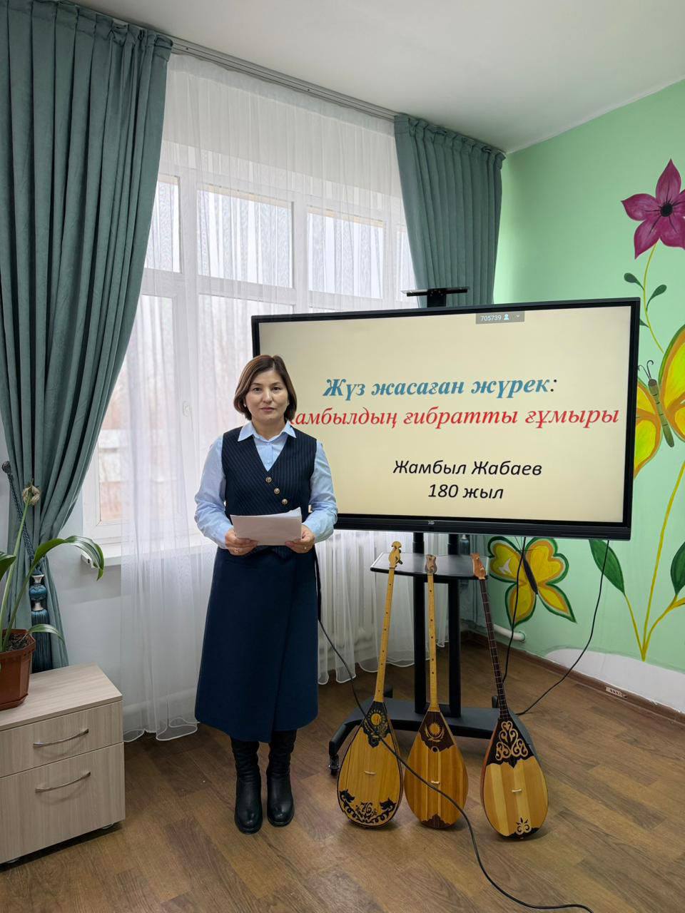 “Балалар кітапханасы”бағдарламасының аясында жүзеге асырылып жатқан “Оқитын сынып” жобасының жұмысына сәйкес 6”А” сынып оқушылары ақынның өмірбаянынан бастап ,шығармаларын ,танымал өлеңдерін баяндап , Бөлтірік пен Жамбылдың айтысынан да көрініс те көрсетті . Директордың тәрбие ісі жөніндегі орынбасары :Байсбаев Біржан оқушылардың өнерлерін бағалап ,сәттілік тіледі.